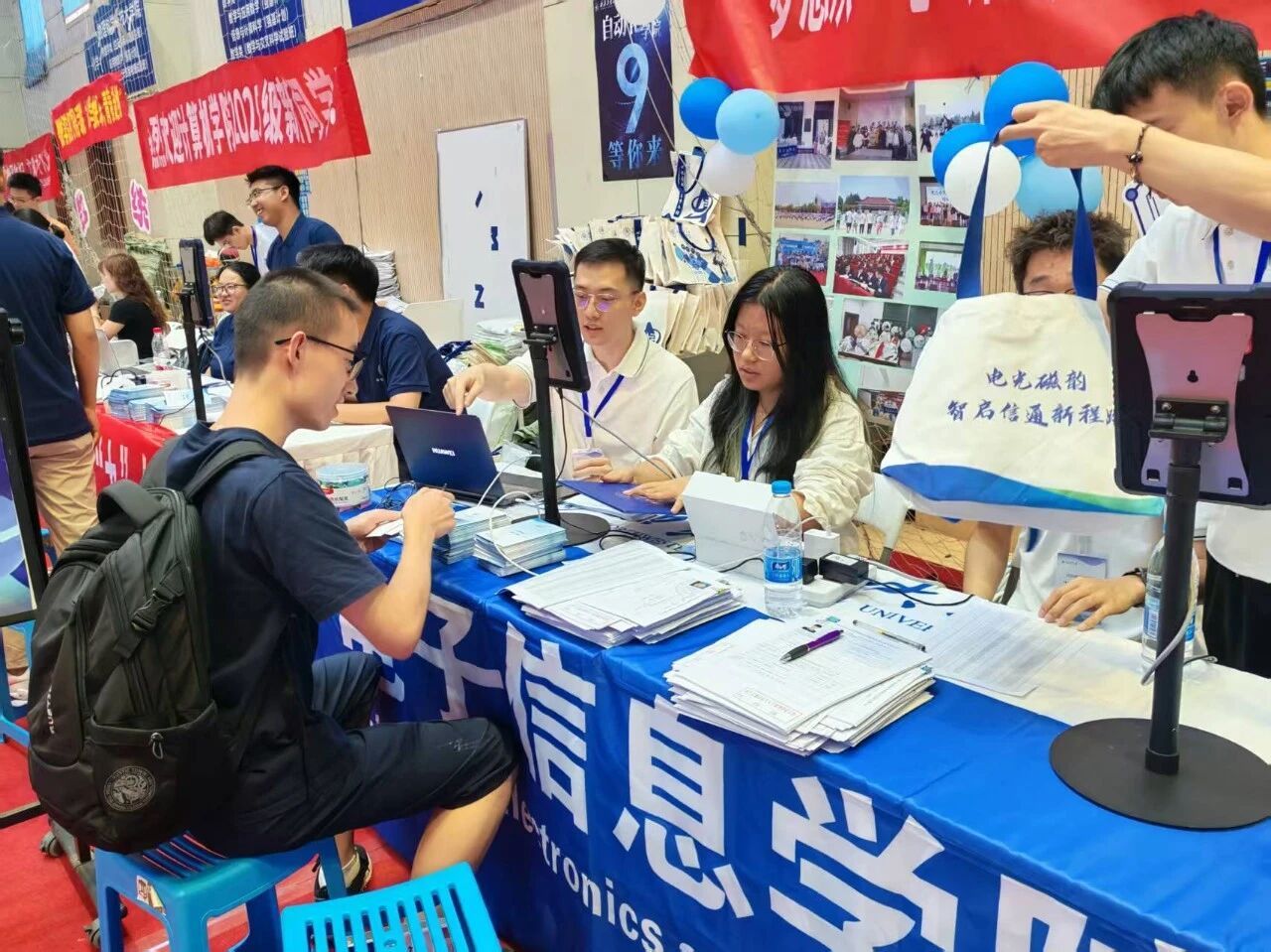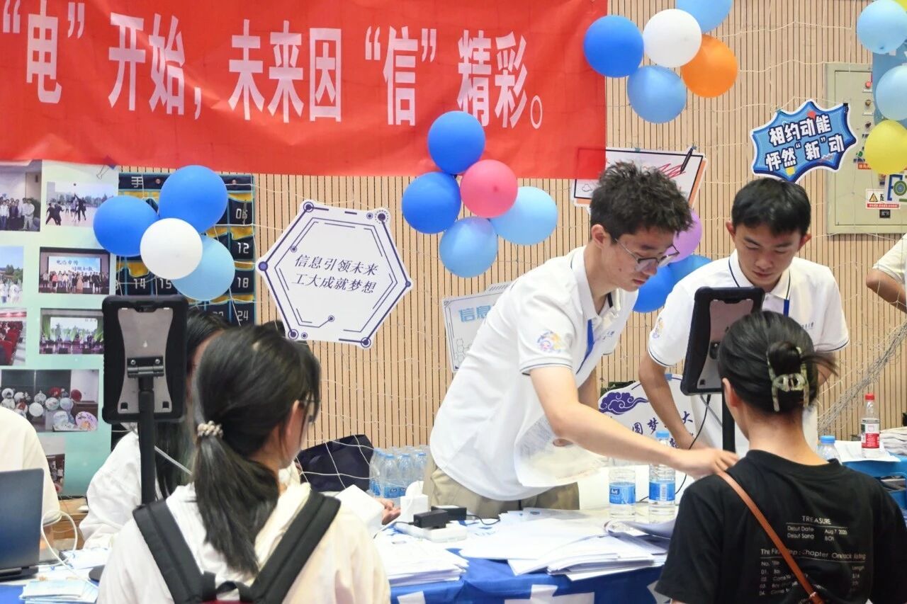 早在七月中旬,电子信息学院便启动迎新筹备工作,成立由院领导牵头的迎新专班,多次召开协调会细化流程,从报到动线设计到物资保障清单逐一敲定。迎新两天,学院专属迎新区域内,蓝白相间的展板清晰标注报到流程,“梦想从“电”开始,未来因“信”精彩” 的醒目标语,文化衫、鼠标垫、钥匙扣、帆布袋等学院专属小礼品让新生初入校园便感受到专业氛围。新生签名活动也吸引了众多学子的积极参与。硕大的签名板矗立在外场报到区中心,成为新生们踏入大学校园后第一个颇具仪式感的打卡点。新生们有序排队,满怀憧憬地拿起签字笔,在签名板上郑重留下自己的姓名。笔迹或工整清秀,或洒脱豪迈,每一个名字都承载着一个崭新的梦想和对未来四年的无限期待。